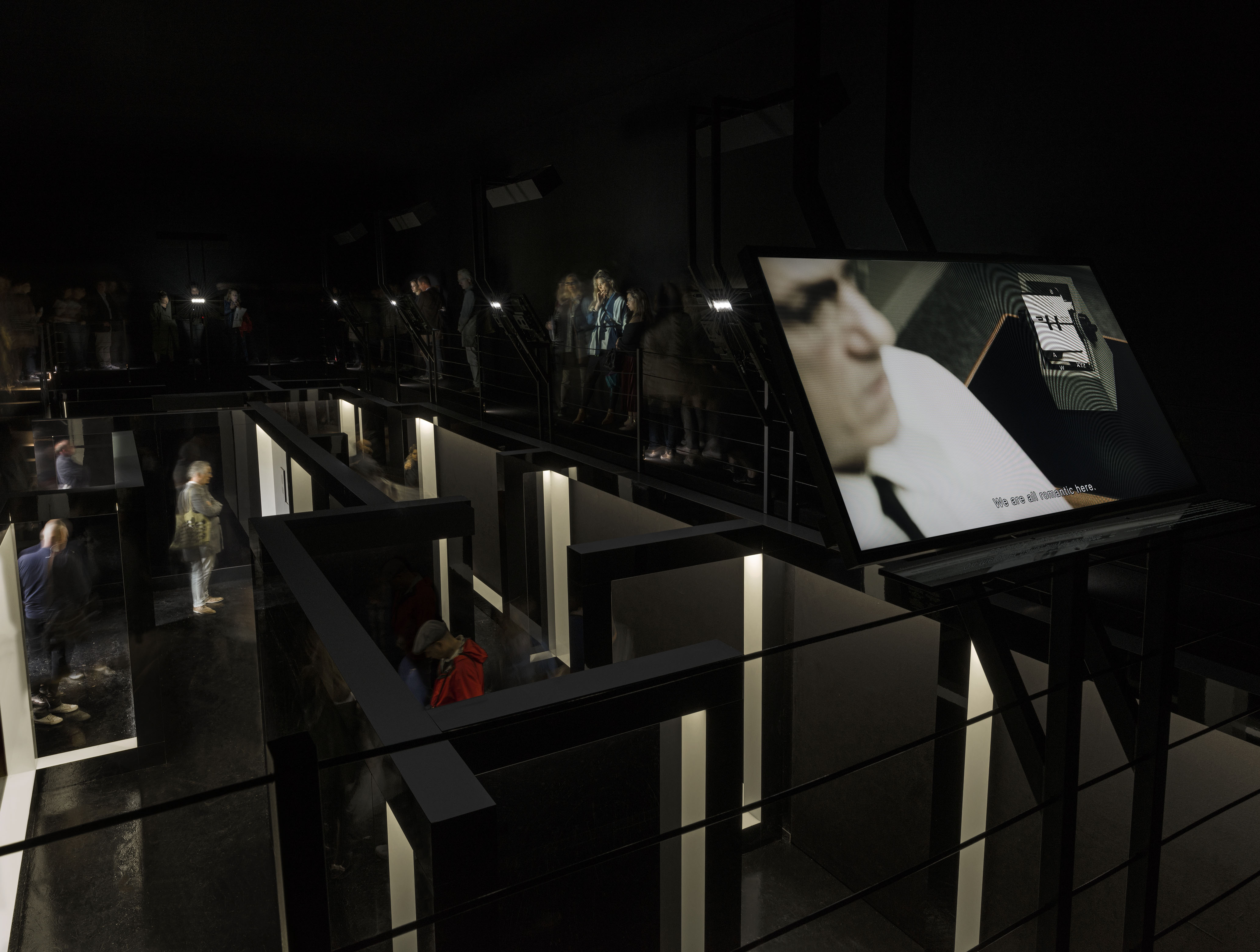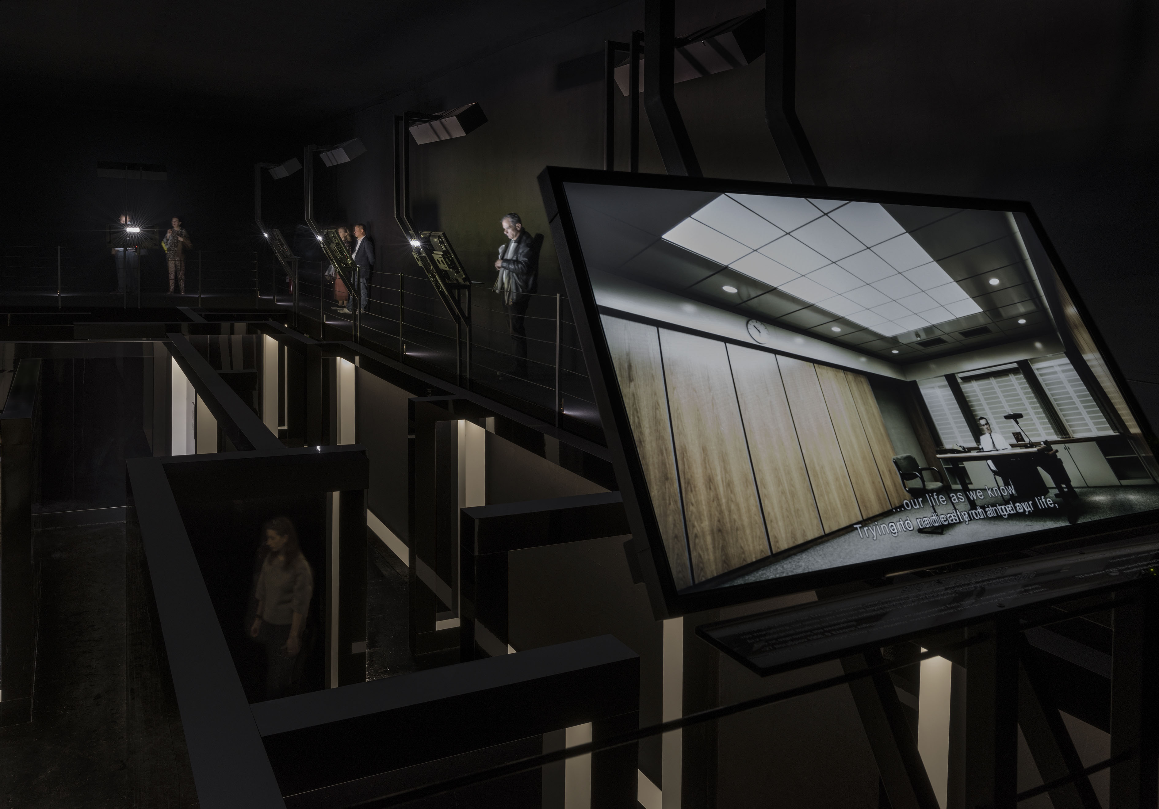 The story is presented piecemeal through multiple video and sound sources inside a Labyrinth.