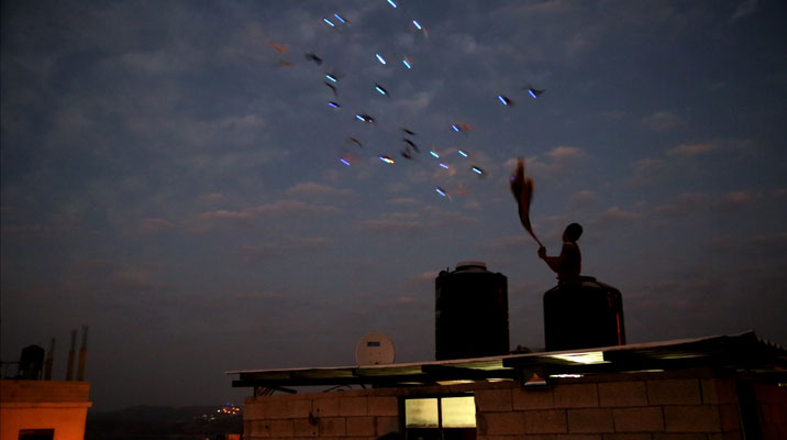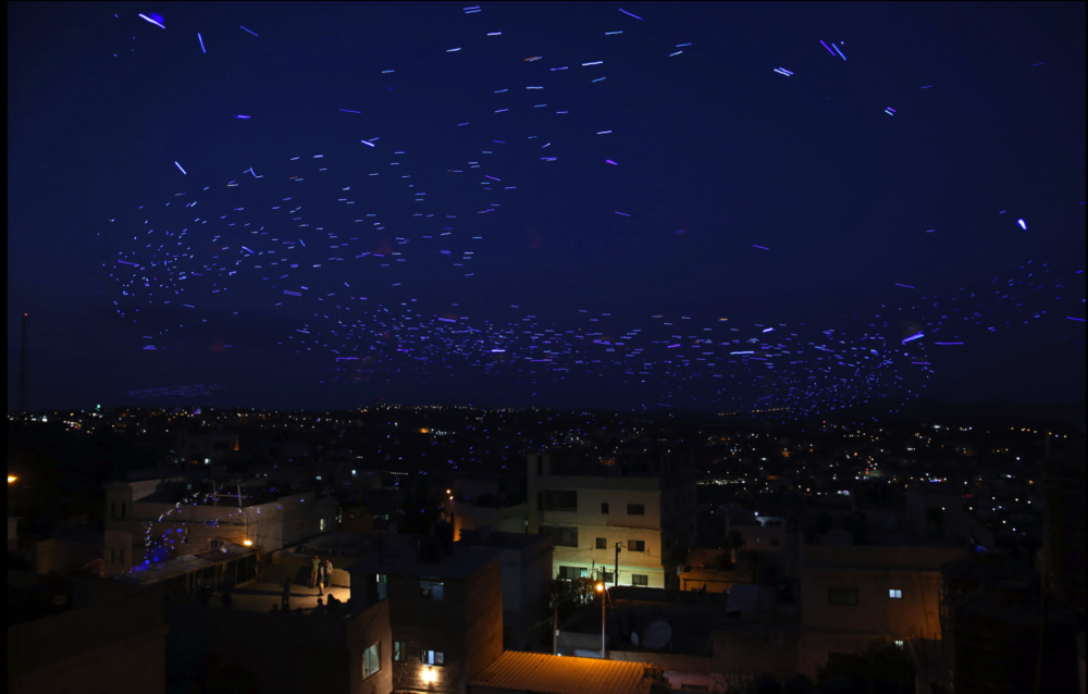 One of Sinnokrot’s latest works is Flight – Jalazone: in this performance the artist has linked the LED lights to the legs of pigeons. The resulting image is a lively and bright constellation in the sky above the field Jalazone. Jalazone was a refugees camp located in the north of Ramallah and directly borders Beit El; built in 1949 it had a population of approximately 10,000 refugees in little more than one square kilometer. The image of birds, with its freedom and nomadic movement, is in contraposition to the constriction of Palestinians that was perpetually controlled by their ID cards, checkpoints and the violent threat.