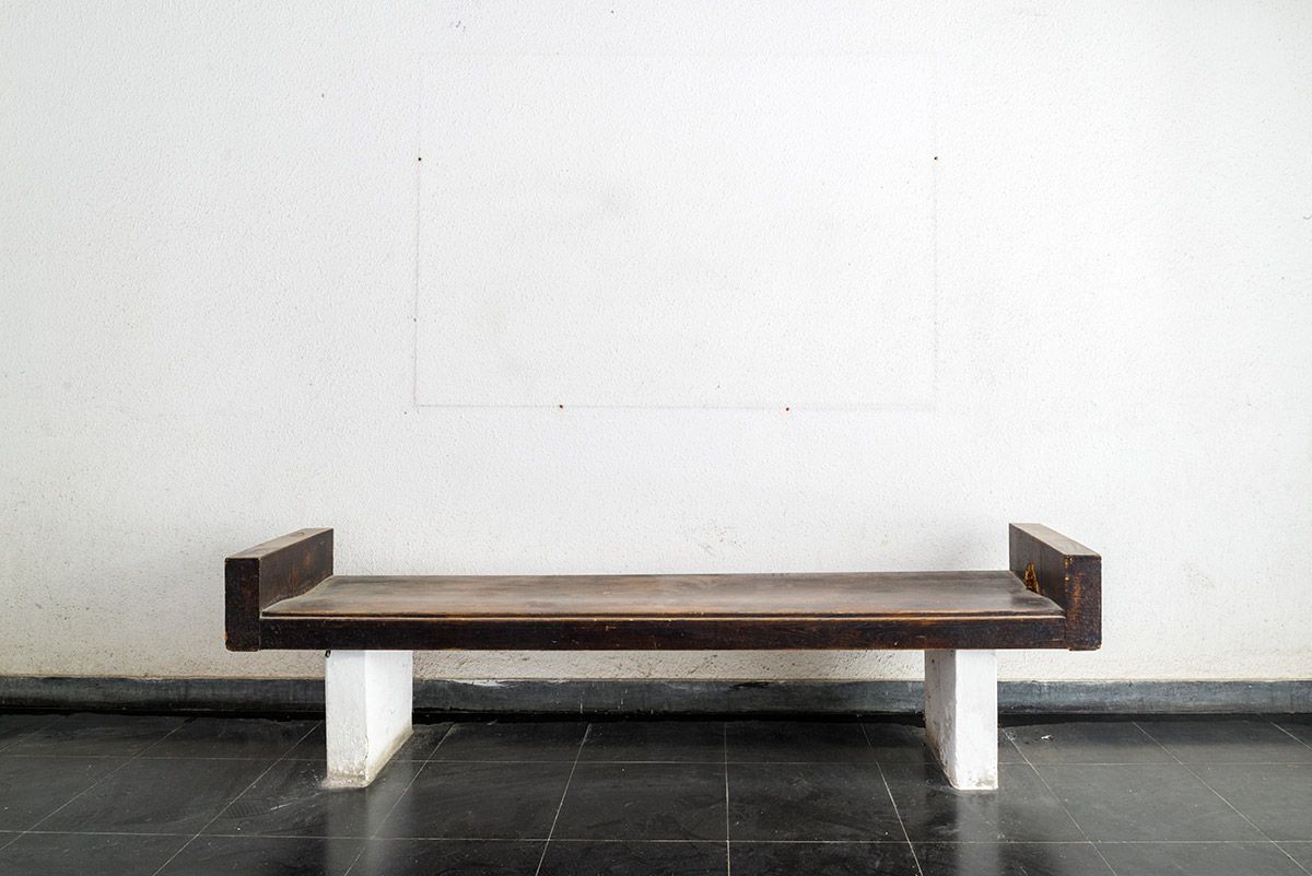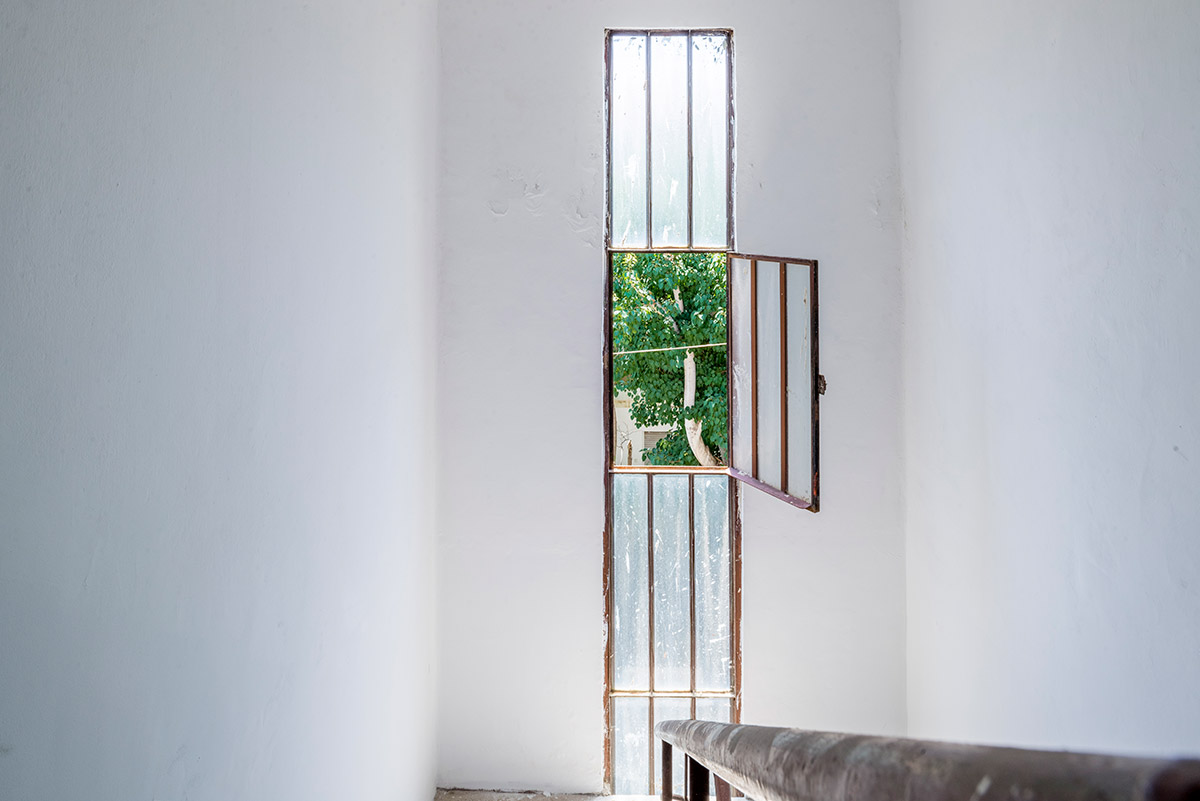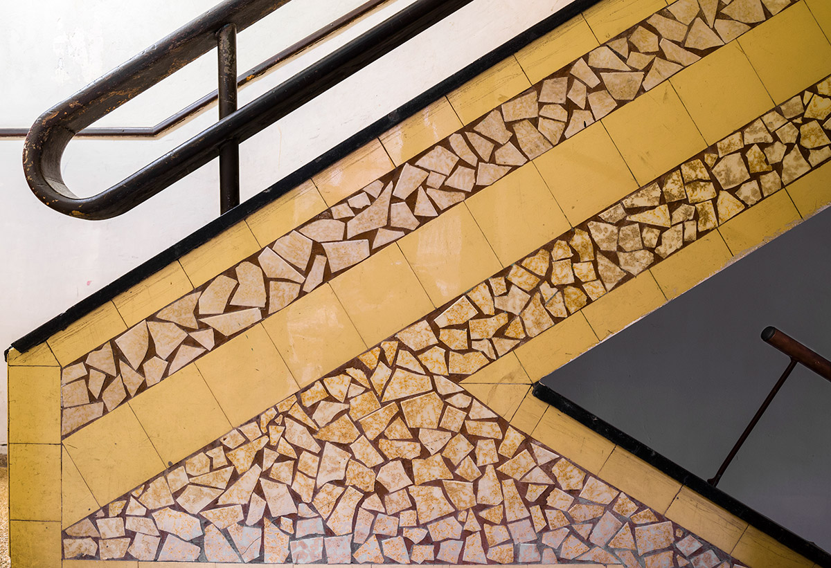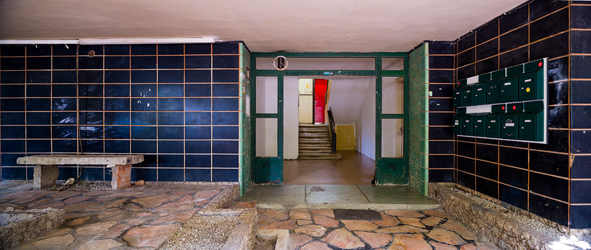 The green and the blue that we encounter daily give life a rhythm tied to nature and our camera looked for those colors inside and outside these buildings so that the photographs have a rhythm. This rhythm of color joins with daily rhythms of action, sitting on a tiled bench, grasping a brass door handle, pulling mail from a wooden mailbox.