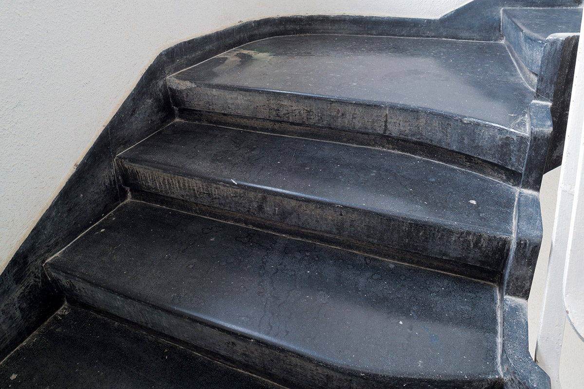 The camera was first set up on the street, facing the entrance, then moved inside the building’s grounds, towards the main entrance. The entrance was photographed, the lobby, the stairs, the landings. Up to the roof and to the blue sky if we could get to it. Building occupants ascend and descend and the camera descended back down the stairway as well, to the lobby but now looking at it from the perspective of someone leaving.